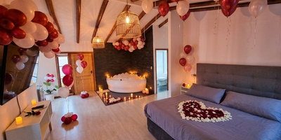 Espuma, burbujas y luz tenue. Todo listo para recibir a tu persona favorita. Habitación decorada con velas, globos y el jacuzzi en su punto exacto con espuma.